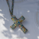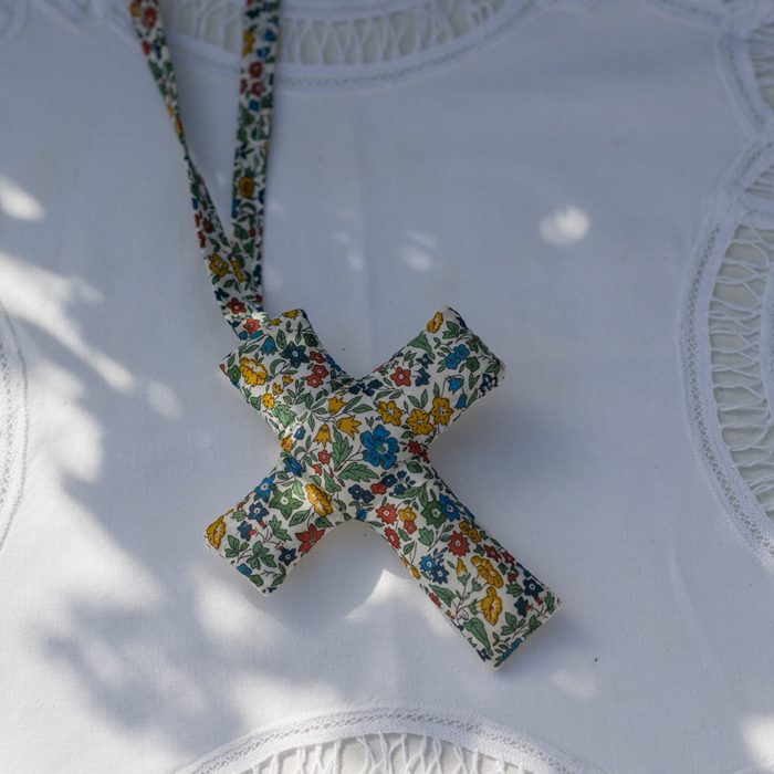 Cruz bordada con detalles florales y reverso en estampado Liberty. Perfecta para el moisés, cuna o el carrito del bebé. Un detalle precioso para regalar en los bautizos o nacimientos