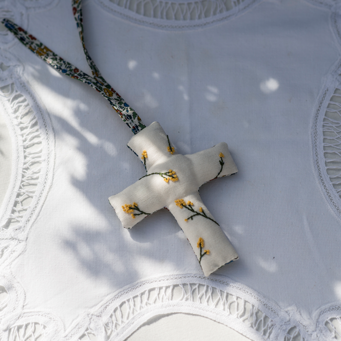 Cruz bordada con detalles florales y reverso en estampado Liberty. Perfecta para el moisés, cuna o el carrito del bebé. Un detalle precioso para regalar en los bautizos o nacimientos