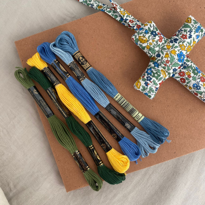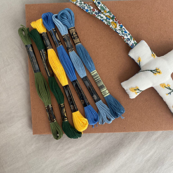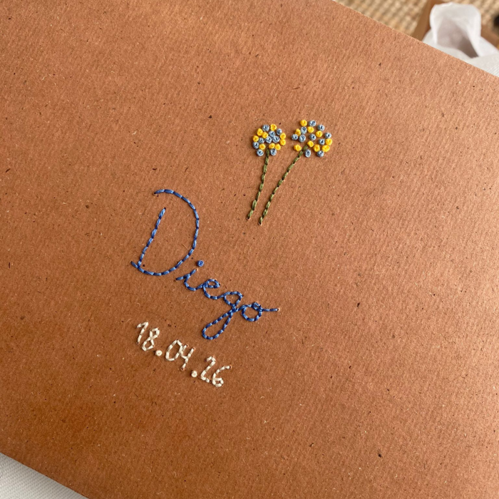 Conjunto de álbum personalizado (nombre, fecha y detalle floral) y cruz bordada con detalles florales y reverso en estampado Liberty. Perfecta para el moisés, cuna o el carrito del bebé. Un detalle precioso para regalar en los bautizos o nacimientos.